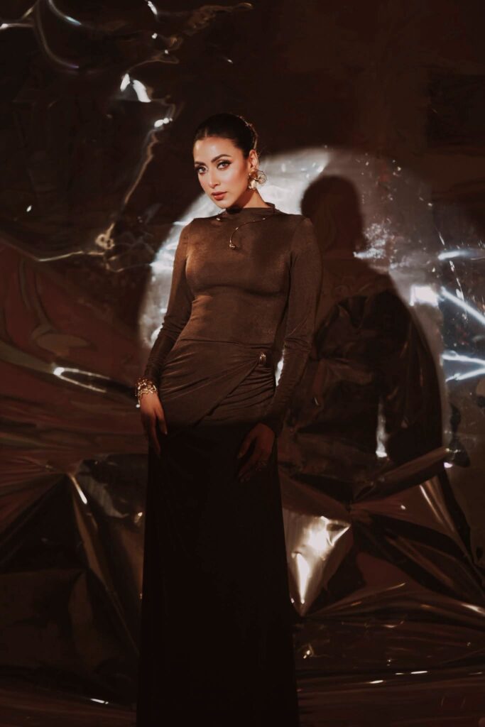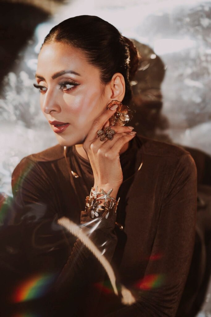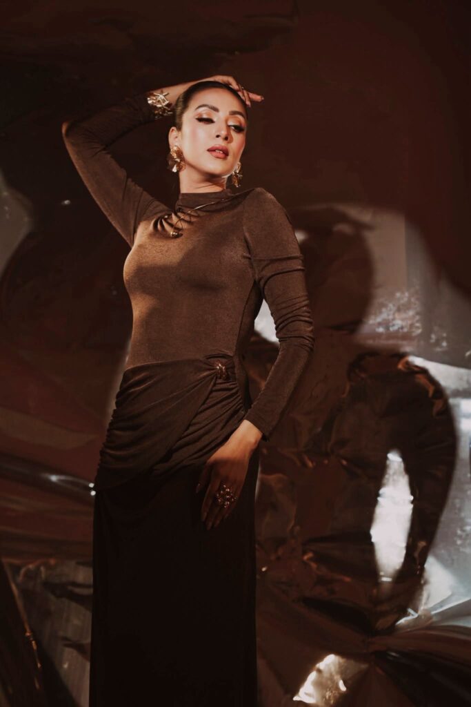 মিমের সাজে ছিল বাঙালিয়ানা ছোঁয়া শাড়ির পাড়ের লাল আভা, হাতে রঙিন চুড়ি, খোলা চুল, কপালে ছোট লাল টিপ এবং সোনালি গয়নায় ফুটে উঠেছে ঐতিহ্যবাহী সৌন্দর্য।
