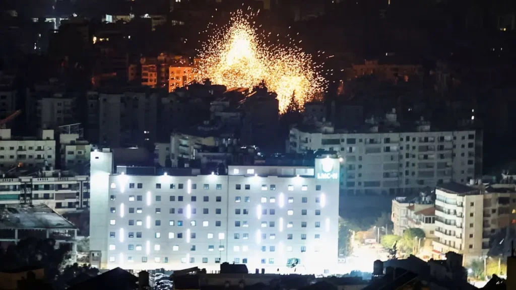 লেবাননে হিজবুল্লাহ ও ইসরায়েলের মধ্যে চরম উত্তেজনার প্রেক্ষাপটে বৃহস্পতিবার বৈরুতের দক্ষিণ শহরতলিতে ইসরায়েলি বিমান হামলার পর আগুনের গোলপিণ্ড ও ধ্বংসাবশেষ ছড়িয়ে পড়ছে। ছবি : রয়টার্স।