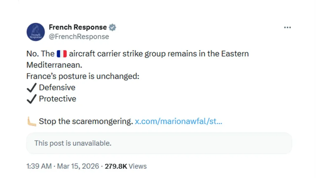 সামাজিক যোগাযোগমাধ্যম এক্স-এ এক পোস্টে ফরাসি মন্ত্রণালয় স্পষ্টভাবে জানিয়েছে, ‘না। বিমানবাহী রণতরী স্ট্রাইক গ্রুপ পূর্ব ভূমধ্যসাগরেই অবস্থান করছে। ফ্রান্সের অবস্থান অপরিবর্তিত : রক্ষণাত্মক, সুরক্ষামূলক।’